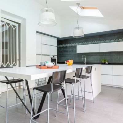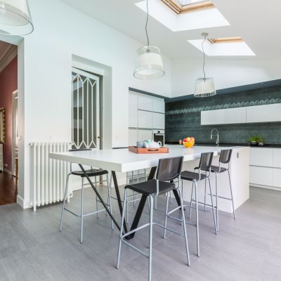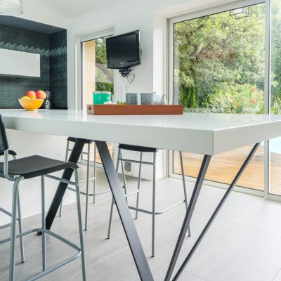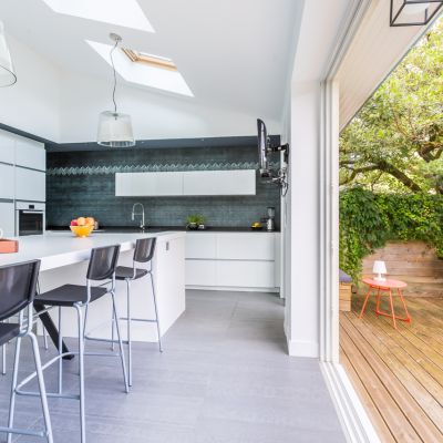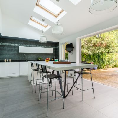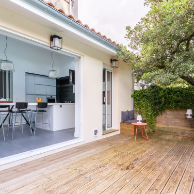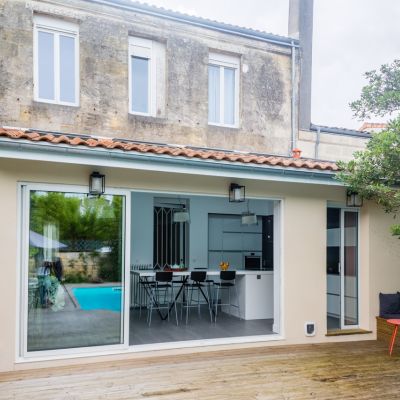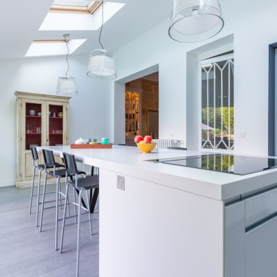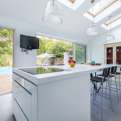 Projet d’architecture intérieure consistant à utiliser la surface d’une véranda pour réaliser une extension vers la terrasse afin de créer une grande cuisine de 28 m2.