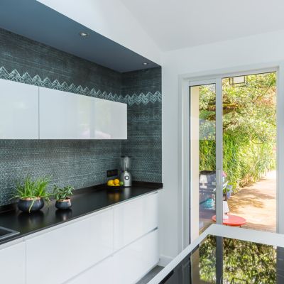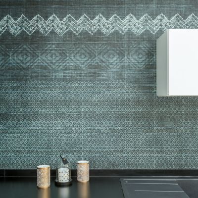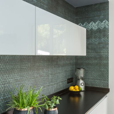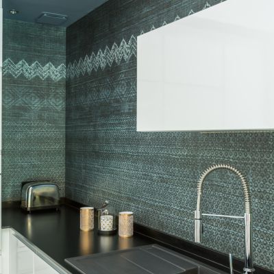 Réalisation d’une crédence en papier peint Wall&deco collection WET SYSTEM (waterproof) modèle “Shibori”.