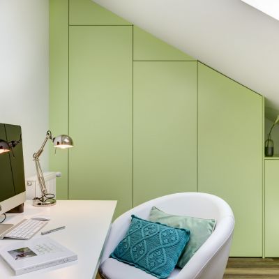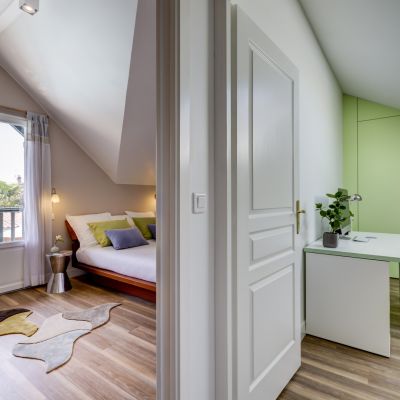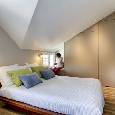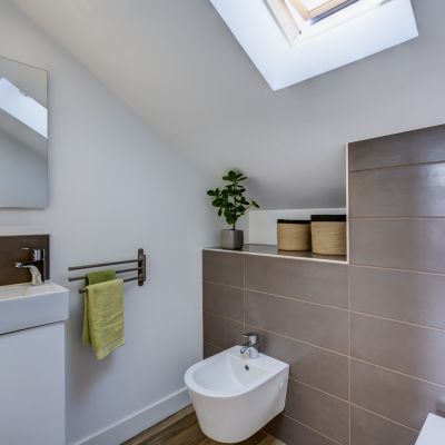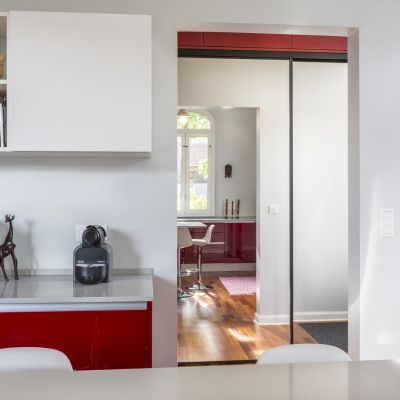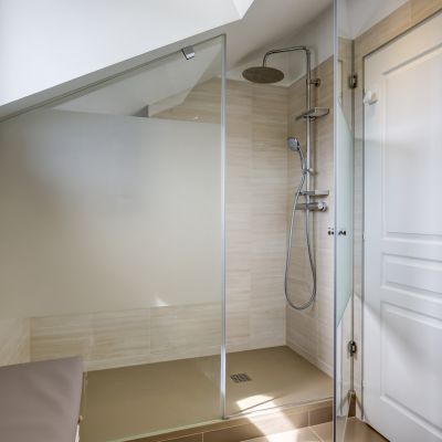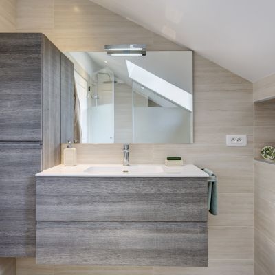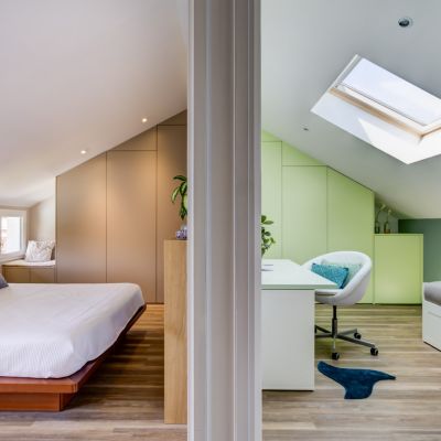 Un beau volume intérieur pour cette maison bouscataise, dans laquelle il a fallu pourtant décloisonner entièrement l’étage pour revoir le volume de la chambre « parents » trop petite (10m2) et créer une salle de bain fonctionnelle et un bureau. L’espace des enfants au rez-de-jardin, a été rénové et valorisé avec la création de salles d’eau privatives.