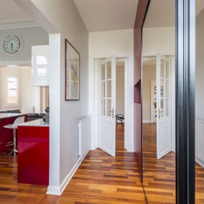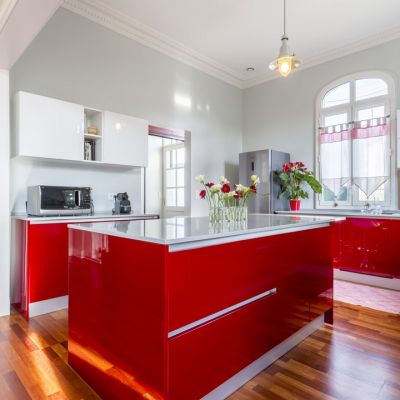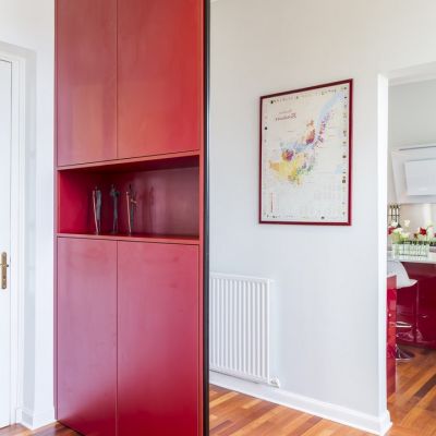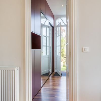 L’entrée principale située au RDC, a été ouverte sur la cuisine neuve et aménagée pour recevoir un petit « coin » Buanderie ainsi que de nombreux rangements.