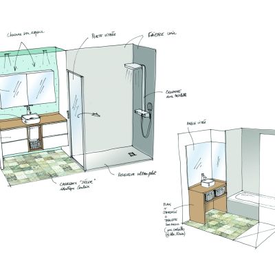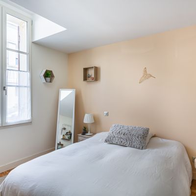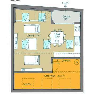 En découvrant la vue sur les jardins mitoyens formant un ilot de verdure, je l’invite à grimper en lui expliquant que sa pièce de vie pourrait être à l’étage, ouverte à l’Ouest sur le soleil couchant, et le coin Nuit au RDC, ce qu’il accepte ravi de cette idée à laquelle il n’avait pas pensé! Le projet d’architecture intérieure a permis l’augmentation de la surface pour atteindre 95 m2 habitable, en plus des 4 m2 de balcon et 4 m2 de courette.