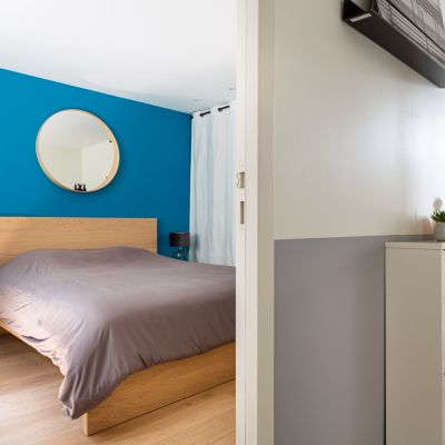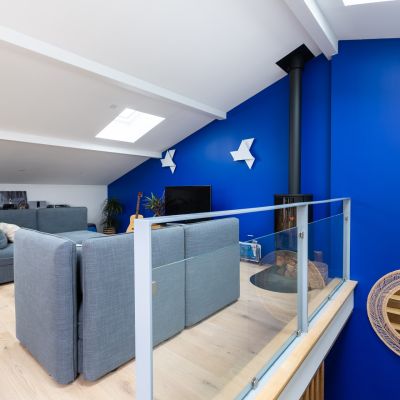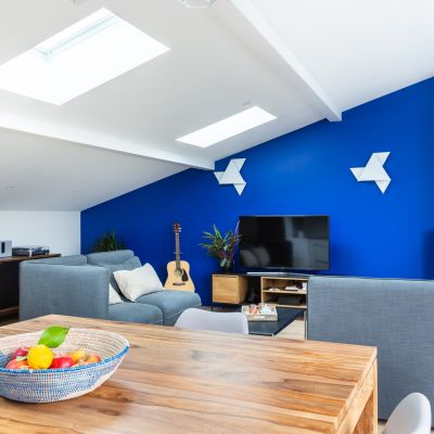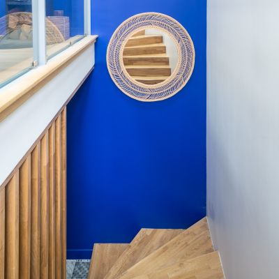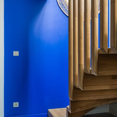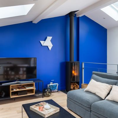 Ses deux derniers souhaits ont été exaucés dans la pièce de vie: celui d’installer un poêle à bois modèle Contura 500 par Techniflammes et placer la couleur bleue proche de celle des “Jardins de Majorelle” grâce à notre partenaire peinture Unikalo.